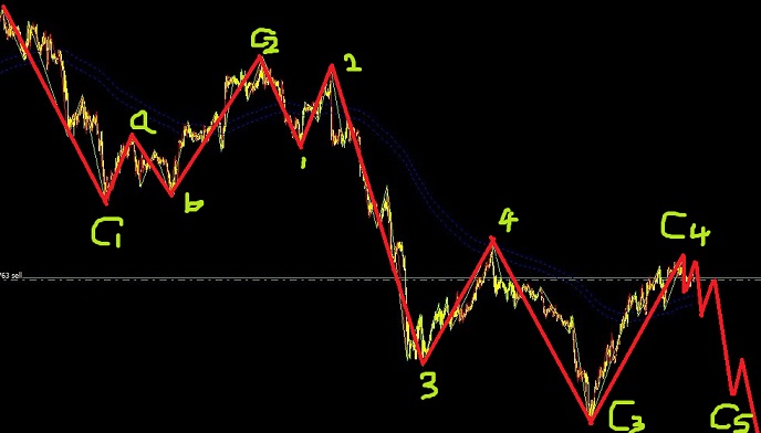 最近黃金需要特別關注,機會良多!如波浪理論圖解中3浪5跌了一個1000點,此時的C浪4離前面3浪4非常接近,波浪理論中非常經典的一個運用縱深原則在此位是可以直接運用的,止損位在4浪的位置,也就是最近的前高-這種屬于左側進場!
