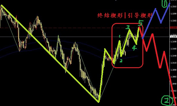 波浪理論圖解很明顯的看出歐元此刻正處于一個形態(tài)轉換,此時因為內部結構都是5波,難以把握到底是引導楔形還是終結楔形,如果現(xiàn)在能提前判斷出是終結后面就非常好操作了,而且會很快迎來一波像樣的空頭行情,如果是多頭的引導楔形,那后面也同樣會迎來一波多頭行情!