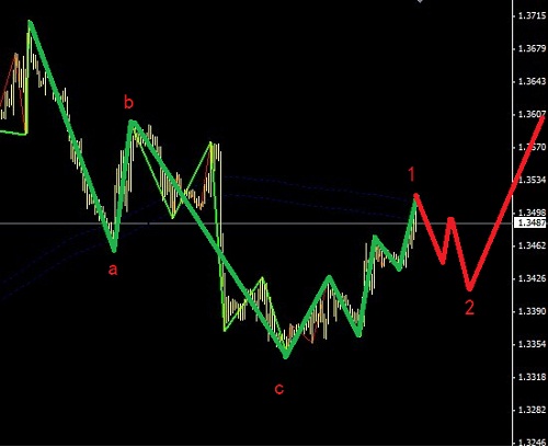 波浪理論實盤推演歐元剛剛完成一輪鋸齒型調整的A-B-C,接著左側完成一個朝五,這種就是右側朝五,也叫順勢小1浪,順勢是因為歐元的大周期就是個多頭。