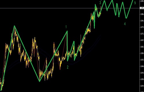 黃金的技術面表現強勢,一波單邊的上漲行情中隱藏的引導楔形構成了小1浪,多頭行情如圖解還有一段要去運行,眼前在3浪的位置之中,建議繼續逢低做多!