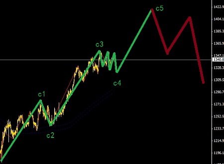 黃金初步判斷還在C5中的5浪2位置,日線上看C5應(yīng)該要破1433,這樣走才比較合理,先生,你認(rèn)為呢