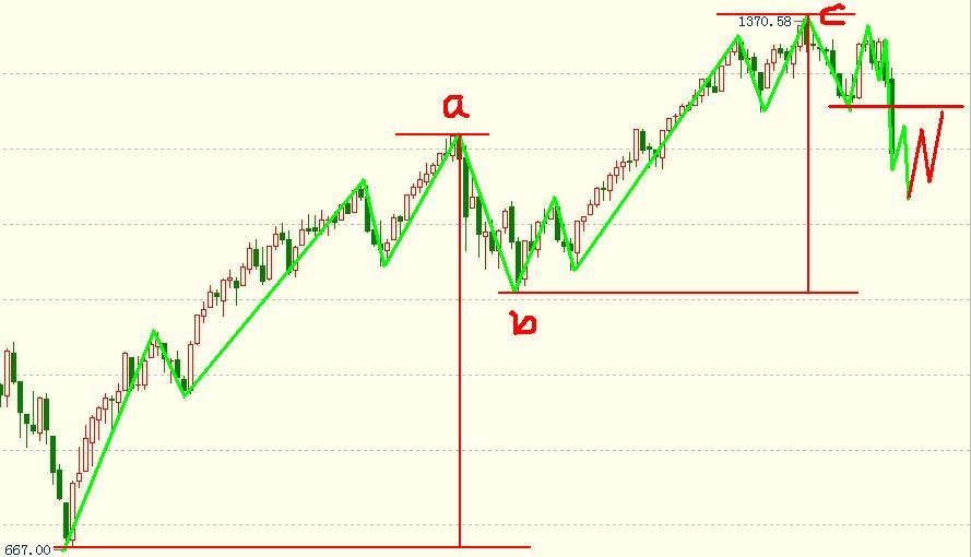 波浪理論實盤推演667.00上漲到1370也就是一個很簡單的3波結構,單純的從概率分布來看,這里C可以是一個短C浪,后面就開始呈現下跌趨勢,而且可以是很猛的一波空頭趨勢,如果不是短C,這里的最后一波多頭也可以看成是大多頭的3浪1,目前來看,想呈現3浪1不是不可能,只是出現這種走勢的幾率實在太??!