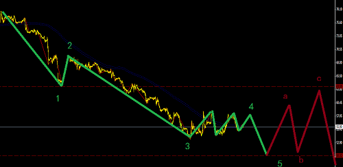 在技術(shù)層面上原油暫時有一個調(diào)整浪出現(xiàn),處于第4浪的位置,如果出現(xiàn)三角形調(diào)整后面的第5浪就是一個空單要出場,等后面的反彈在繼續(xù)做空,整體的節(jié)奏市場后面出現(xiàn)比圖解中的4浪時間更長級別更大的調(diào)整,是一個持續(xù)短線的好機(jī)會!