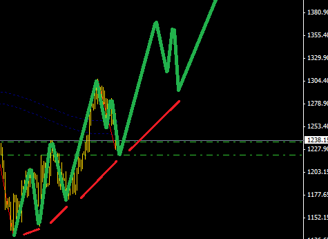 波浪理論圖解上黃金在一個寬幅的一波流多頭里面,意思是指市場推動一波之后需要回調一段至少為前面推動浪50%的行情在去延續之前的趨勢。