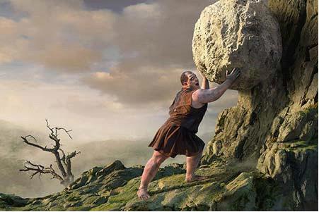 古希臘神話中,西西弗斯因為在天庭犯了法,被大神懲罰,降到人世間來受苦。對他的懲罰是:要推一塊石頭上山。每天西西弗斯都費了很大的勁把那塊石頭推到山頂,然后回家休息,但到了晚上石頭又會自動地滾下來,于是,第二天又要把那塊石頭往山上推……