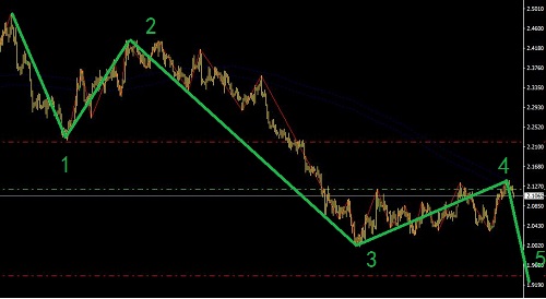 美銅的4小時級別正在延長浪之中的小4浪末期,4浪這個位置市場已經經過反復輾轉回調,當下正是一個好的進場時機,如波浪理論操作圖解所示進場位就在2.1200,止損放在2.2200也就是前面的1浪底部,目標位1.9500!