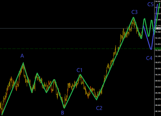 美元指數的天圖級別目前處在一個調整區間,波浪理論圖解中處于C浪4的位置,這個位置目前的變化有三種,圖中給大家畫出了兩種,三角形調整鋸齒型調整,市場究竟要選擇哪一種調整方案,高度關注市場這次向上的點位是93.25~92.10這一波行情的黃金比例,如果是764那么市場就要去偏向平臺調整或者三角形,如果只有618或者50%那么這次就是要去走鋸齒型調整;
