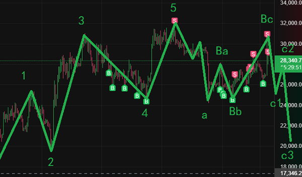 下面比特幣的天圖已經用波浪理論圖解清晰的數浪標注出來,目前所處的位置在B浪C,后面有空頭C浪1,然后C2,就出現C浪3了