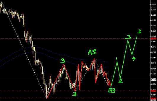 澳元和歐元有所不同,波浪理論圖解中A是個朝五,后面出現了很復雜的平臺型B浪,這種位置可以博后面的C浪,也有280點的行情,這兩個貨幣暫時來看歐元比澳元強一點,可以優先做多歐元,不過不建議加倉。