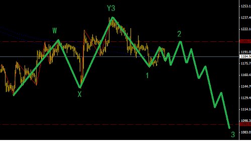 右上:市場(chǎng)的C浪位置只走了3波就下去了,這在黃金2011年12月8號(hào)到2012年9月30號(hào)就是標(biāo)準(zhǔn)的3-3-3平臺(tái)型調(diào)整結(jié)構(gòu);